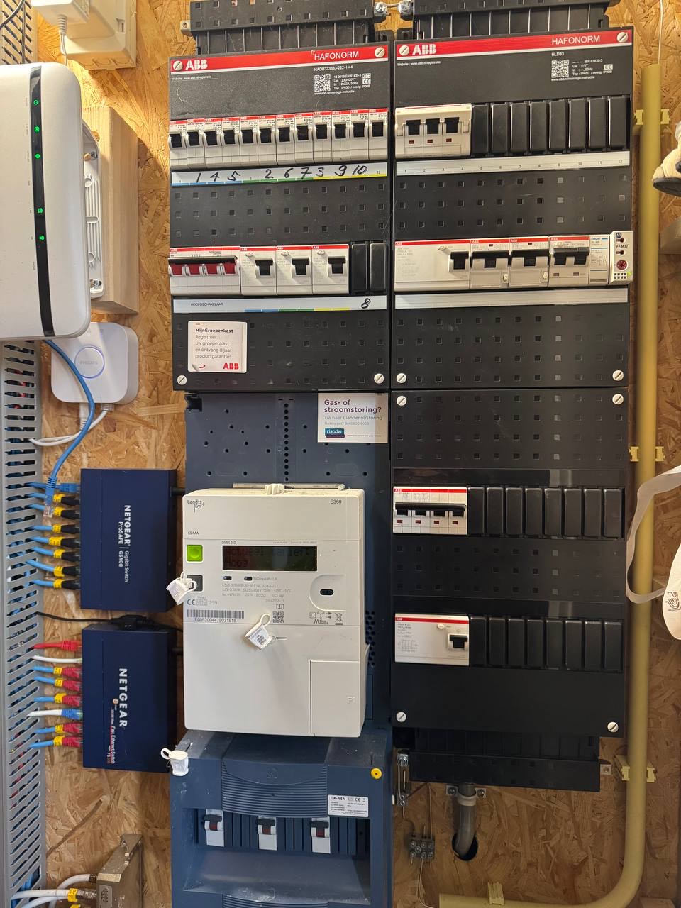 Meterkast aanpassen: gebruik ongebruikte groep en herverdeling fasen: Ik zoek een erkende elektricien voor het volgende: Gebruik van ongebruikte groep voor airco: In mijn meterkast zijn twee ongebruikte groepen (16A, 230V). Eén van deze groepen wil ik gebruiken voor mijn airco. Er is al een stopcontact bij de airco; er hoeft alleen een nieuwe kabel vanaf de meterkast naar dit stopcontact aangesloten te worden. De groep moet correct gelabeld en aangesloten worden volgens NEN 1010. Fasebalancering: Mijn woning heeft een 3-fase aansluiting (3×25A). Huidige verdeling: Fase 1: Fornuis en kookplaat Fase 2: Magnetron en koelkast Fase 3: Overige groepen Ik wil de airco-groep verplaatsen om de belasting